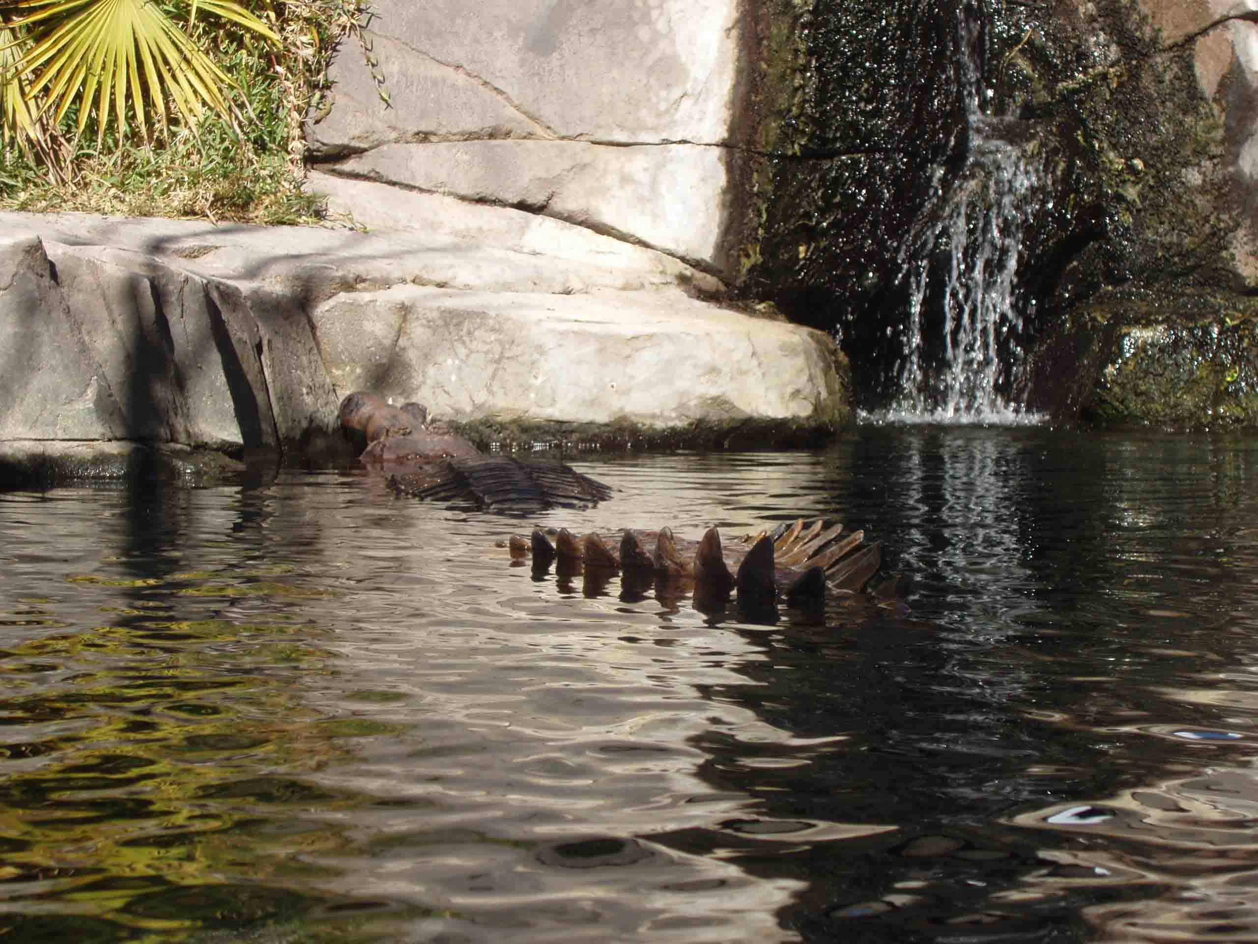 In de dierentuin van Fuengirola kun je de krokodillenvijver ook onder water bekijken. Er hangt een enorm exemplaar in het water, roerloos, met de vier poten recht naar beneden. Zijn buik lijkt op de onderkant van een boot. De stekels van zijn rug steken als een verweerd rotsblok boven het water uit, de staart drijft daarachter. Hij heeft zijn kop afgewend van het glas.